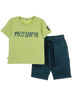 Футболка с коротким рукавом, на рукаве декоративный элемент. Спереди стильный принт. Изготовлен из кулирки с эластаном. Шорты с двумя карманами с отрезным бочком. Низ бшорт с отворотом, на поясе декоративная тесьма. Изготовлены из петельчатого футера с эластаном.