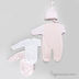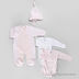 Мягкий велюровый комплект, состоящий из комбинезона, двух боди и шапочки. Комбинезон застегивается на кнопки на косую планку. Длинный прямой рукав. Трикотажное боди завязывается на ленточки и застегивается на кнопки в шаговом шве. Оригинальная велюровая шапочка дополнена трикотажными завязками.