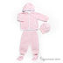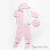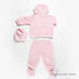 Мягкий велюровый комплект, состоящий из берета, пинеток, куртки и штанов. Куртка с капюшоном застегивается на кнопки. Декорирована вышивкой в виде собачки. Штаны на плотной резинке. Низ собран на трикотажную резинку в мелкий рубчик. Берет собран на трикотажную резинку в мелкий рубчик. Пинетки на трикотажной резинке в мелкий рубчик.