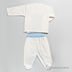 Мягкий велюровый комплект, состоящий из кофты и ползунков. Кофта с голубой трикотажной вставкой застегивается на левом плече на кнопки. Длинный прямой рукав. Ползунки с голубой трикотажной вставкой на плотной резинке. Комплект декорирован набивным рисунком.