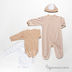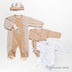 Мягкий велюровый комплект, состоящий из комбинезона, двух боди и шапочки. Комбинезон застегивается на кнопки на косую планку. Длинный прямой рукав. Трикотажное боди завязывается на ленточки и застегивается на кнопки в шаговом шве. Оригинальная велюровая шапочка с трикотажным отворотом.