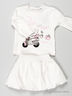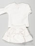Детали: лонгслив с округлым вырезом горловины, длинные рукава немного присборены на линии плеч, полочка декорирована вышивкой и принтом со стразами. Расклешенная юбка с поясом на мягкой резинке декорирована бантом.