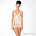 Комплект из топа и трусов. Топ из эластичного, приятного на ощупь материала. Отрезной лиф, украшенный кружевом. Регулируемые бретельки. Спереди небольшой разрез. Трусы шортики, по краю декорированные кружевом.