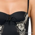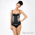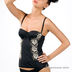 Комплект из корсета и трусов. Корсет из эластичной ткани, декорированный вышивкой. Без каркаса. Бюстгалтер типа балконет. Чашечки на косточках с небольшим эффектом push-up(поролоновый уплотнитель) без швов. Чашечки соеденены небольшой шнуровкой. Съемные регулируемые бретельки. Верх изделия пасажен ан резинку. Застегивается сзади на крючки в два ряда. Сетчатая подкладка. Трусики слипы.