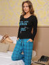 Очаровательный комплект, состоящий из лонгслива и брюк выполнен из тонкого трикотажа. Лонгслив с округлым вырезом горловины и с длинным прямым рукавом. Полочка декорирована оригинальным набивным рисунком. Брюки с отрезным поясом на кулиске с атласной лентой, два кармана.