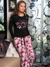 Очаровательный комплект, состоящий из лонгслива и брюк выполнен из тонкого трикотажа. Лонгслив с округлым вырезом горловины и с длинным прямым рукавом. Полочка декорирована набивным рисунком. Брюки с отрезным поясом на кулиске с атласной лентой, два кармана.