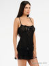 Романтичный комплект, состоящий из сорочки и трусиков-стрингов выполнен из сетчатой эластичной ткани. Отрезной лиф и середина полочки выполнены из кружевного эластичного гипюра, тонкие эластичные лямки. Низ изделия декорирован сетчатыми оборками и атласными бантами. В комплекте ажурные трусики-стринги.