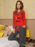 Очаровательный комплект, состоящий из лонгслива и брюк выполнен из тонкого трикотажа. Лонгслив с округлым вырезом горловины и с длинным прямым рукавом, полочка декорирована оригинальным набивным рисунком. Брюки с отрезным поясом на кулиске с атласной лентой, два кармана.