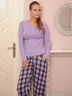 Очаровательный комплект, состоящий из лонгслива и брюк выполнен из тонкого трикотажа. Лонгслив с округлым вырезом горловины и с длинным прямым рукавом. Брюки с отрезным поясом на кулиске с атласной лентой, два кармана.