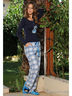 Очаровательный комплект, состоящий из лонгслива и брюк выполнен из тонкого трикотажа. Лонгслив с округлым вырезом горловины и с длинным прямым рукавом. Застежка на две пуговицы. Брюки с отрезным поясом на кулиске с атласной лентой, два кармана.