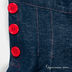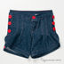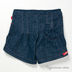 Короткие шорты свободного кроя застегиваются на молнию и пуговицы. В пояс вшита резинка. Сзади один карман. Большие разрезы по бокам изделия. Рядом с боковым швом спереди нашиты декоративные пуговицы.