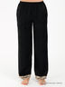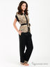 Женский комплект состоит из кофты и брюк. Выполнен из натурального шелка с жаккардовым плетением. Кофта с коротким цельнокроеным рукавом и отложным воротом застегивается на пуговицы и завязывается на поясок. Декорирована оригинальным принтом и контрастными вставками. Брюки на резинке декорированы манжетами с принтом.