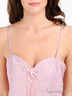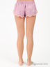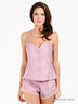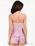 Женский комплект состоит из топа и шорт. Выполнен из натурального шелка с жаккардовым плетением. Топ на тонких регулируемых бретелях декорирован спереди сетчатой вставкой со шнуровкой. Шорты с отрезным поясом посажены на резинку сзади, проймы с сетчатой окантовкой.