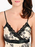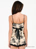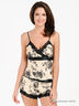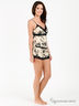 Женский комплект состоит из топа и шорт. Выполнен из натурального шелка с жаккардовым плетением. Топ на тонких регулируемых бретелях дополнен пристроченным пояском под грудью. Шорты с отрезным поясом посажены на резинку сзади. Комплект декорирован оригинальным принтом и кружевной окантовкой.