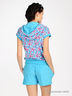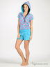 Комплект из олимпийки и шортиков. Олимпийка махровая , из натурального хлопка. Капюшон с кулиской по краю. Короткие рукава. Застегивается на молнию. Два накладных кармана. Манжеты, края карманов и низ изделия посажены на трикотажную резинку. Шорты махровые, расклешенного покроя. Верх изделия посажен на широкую трикотажную резинку с кулиской. Два накладных кармана. Сзади треугольная кокетка.