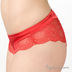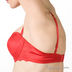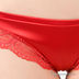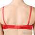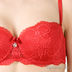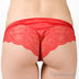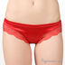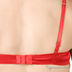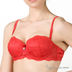 Страснтный комплек яркого красного цвета. Бюстгальтер-балконет с небольшим уплотнителем и съемными бретелями. Между чашек стильная подвеска. Ажурные трусики слип с узкой резинкой на широком поясе.
