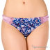 Элегантный комплект нижнего белья из сатина с пестрым принтом. Бюстгальтер на косточках с гелевым Push-up. Верхний обрез чашечек украшен однотонным сатином, а из соединение -подвеской с атласным бантиком. Боковинки имеют дополнительные корректирующие вставки. Бретели декорированы цветами из органзы с шитьем и регулируются по длине. Застежка на один крючок. Петли застежки расположены в четыре ряда, что обеспечивает наилучшую посадку по фигуре. Трусики-стринг с ластовицей на хлопковой подкладке также отделаны однотонным сатином сиреневого цвета и цветами из органзы с шитьем.