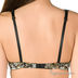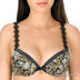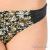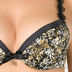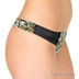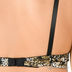 Элегантный комплект нижнего белья из сатина с пестрым принтом. Бюстгальтер на косточках с гелевым Push-up. Верхний обрез чашечек украшен однотонным сатином, а из соединение -подвеской с атласным бантиком. Боковинки имеют дополнительные корректирующие вставки. Бретели декорированы цветами из органзы с шитьем и регулируются по длине. Застежка на один крючок. Петли застежки расположены в четыре ряда, что обеспечивает наилучшую посадку по фигуре. Трусики-стринг с ластовицей на хлопковой подкладке также отделаны однотонным сатином черного цвета и цветами из органзы с шитьем.