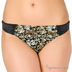 Элегантный комплект нижнего белья из сатина с пестрым принтом. Бюстгальтер на косточках с гелевым Push-up. Верхний обрез чашечек украшен однотонным сатином, а из соединение -подвеской с атласным бантиком. Боковинки имеют дополнительные корректирующие вставки. Бретели декорированы цветами из органзы с шитьем и регулируются по длине. Застежка на один крючок. Петли застежки расположены в четыре ряда, что обеспечивает наилучшую посадку по фигуре. Трусики-стринг с ластовицей на хлопковой подкладке также отделаны однотонным сатином черного цвета и цветами из органзы с шитьем.