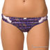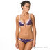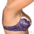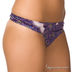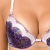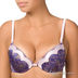 Яркий комплект с рисунком в виде мелких цветов на насыщенно-синем фоне. Чашечки "пуш-ап" с гелем декорированы лиловой вставкой с ажуром, а между ними и на бретелях маленькие бантики. Трусики стринг так же декорированы бантиком и ажурными вставками.