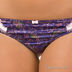Яркий комплект с рисунком в виде мелких цветов на насыщенно-синем фоне. Чашечки "пуш-ап" с гелем декорированы лиловой вставкой с ажуром, а между ними и на бретелях маленькие бантики. Трусики стринг так же декорированы бантиком и ажурными вставками.