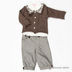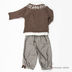 Комплект состоит из блузы, жакета и брюк. Блуза с отложным воротом и длинным рукавом на пуговицах. Жакет с длинным рукавом застегивается на пуговицы. Брюки на резинке, низ изделия дополнен трикотажными манжетами.
