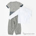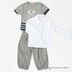Комплект для девочки состоит из рубашки, джемпера и брюк. Рубашка с отложным воротом и длинным рукавом застегивается на пуговицы спереди. Джемпер с круглым вырезом и коротким рукавом декорирован принтом. Брюки с отрезным поясом внизу присборены на ленту.