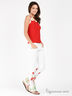 Детали: топ с округлым вырезом горловины, декорирован вязаным цветком, брюки застегиваются на молнию и на пуговицу, втачной пояс со шлевками для ремня, четыре кармана, низ изделия декорирован росписью.