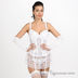 Кружевной корсет на каркасе из эластичной сетки со вставками из искристого атласа. Регулируемые бретельки, декорированы оборками. Формованные чашечки на косточках с диагональным швом. Чашечки с эффектом push-up (съемный поролоновый уплотнитель). Застегивается сзади на крючки. Съемные регулируемые подвязки. Декорирован кружевной оборкой, создающий эффект юбки.