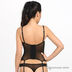 Кружевной корсет на каркасе. Регулируемые бретельки. Формованные чашечки на косточках с вертикальным швом. Чашечки с эффектом push-up ( поролоновый уплотнитель). Застегивается сзади на крючки. Съемные регулируемые подвязки.
