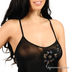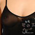 Комплект состоит из топа и трусиков стрингов. Выполнен из тонкой эластичной сетчатой ткани. Топ на тонких эластичных бретелях, которые регулируются по длине и перекрещиваются на спине. Декорирован оригинальными нашивками с пайетками. Трусики с ластовицей на хлопковой подкладке, декорированы оригинальной резинкой с люрексом.