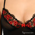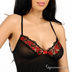 Комплект состоит из комбинации и трусиков стрингов. Выполнен из эластичной сетчатой ткани с кружевными вставками с вышивкой. Комбинация с оригинальной прорезью на спине и атласным бантом. Эластичные бретели перекрещиваются и регулируются по длине. Трусики с ластовицей на хлопковой подкладке.