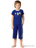 Комплект состоит из футболки и укороченных брюк свободного кроя, выполненных из высококачественного трикотажного полотна синего цвета, гарантирующего идеальную посадку по фигуре. Футболка классического кроя, полуприлегающего силуэта. Рукава и вырез по горловине оформлены кантами двух цветов. На передней детали расположен тройной принт «Моряки». Брюки комфортной посадки с отрезным поясом запакованного типа. Слева, на передней детали расположены две полоски и принт «Штурвал». Пояс трехцветный, на задней детали расположена фирменная нашивка.