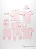Комплект состоит из распашонки, ползунков, комбинезона, футболки, боди, слюнявчика, шапочки и царапок.