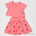 Комплект состоящий из двух предметов: болеро, платье. Болеро с короткими рукавами и застежкой на пуговицу, украшено нашивкой. Платье на тонких бретелях, низ расклешен, верх с запахом, изделие украшено набивным принтом и прострочкой.