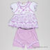 Детский комплект из двух предметов. Легкое полупрозрачное платье с округлым вырезом горловины, рукава "фонарики", застежка на пуговицы. Шорты с эластичной резинкой в поясе, украшены рюшами.