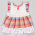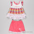 Детский комплект из двух предметов. Легкое платье с округлым вырезом горловины, короткие рукава, застежка на пуговицу. Шорты с эластичной резинкой в поясе, украшены рюшами.