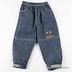 Трикотажная толстовка с капюшоном и карманом "кенгуру". Центральная застежка на молнию. Длинные рукава с эластичными манжетами. Аппликация на полочке. Эластичная манжета по низу изделия. Ткань с рисунком. Трикотажный лонгслив с круглым вырезом горловины. Длинные рукава. Принт на полочке. Джинсовые брюки на резинке. Боковые прорезные карманы. Вышивка. Контрастная отстрочка.