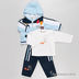 Комплект состоящий из трех предметов: куртка, лонгслив и спортивные штаны. Куртка с капюшоном и застежкой на молнию, хлопковый подклад, спереди два втачных кармана. Лонгслив с округлым вырезом горловины и застежкой на пуговицы, украшен фигурной прострочкой. Штаны прямого кроя, в поясе вставка из эластичной резинки, декорированы прострочкой.