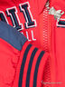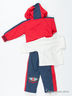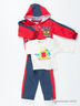 Комплект состоит из олимпийки, лонгслива и брюк. Олимпийка из тонкой плащевки с трикотажной подкладкой, с глубоким капюшоном застегивается на молнию, длинный прямой рукав присборен на манжету, два кармана. Лонгслив с округлым вырезом горловины выполнен из трикотажа, застегивается на пуговицы на плече, полочка декорирована забавным рисунком. Брюки из плащевки с трикотажной подкладкой. Пояс на резинке.