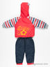 Комплект из 2-х предметов. Верхняя ткань - болоньевая плащевка. Курточка с капюшоном утеплена синтепоном и застегивается на кнопки на полочке. Капюшон с "ушками". Подкладка - флис. Брюки утеплены синтепоном, пояс на резинке. Подкладка - хлопок. Изделие украшено нашивками.