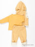 Теплый и мягкий комплект состоит из жилета, джемпера и брюк. Джемпер с синтепоновым наполнителем и с трикотажной поверхностью. Округлый вырез горловины, застежка на пуговицы на плече, длинный прямой рукав. Жилет с микровельветовой поверхностью и с синтепоновым наполнителем. Глубокий капюшон, застежка на пуговицы, два кармана. Брюки с микровельветовой поверхностью и с синтепоновым наполнителем. пояс на резинке, два кармана, отвороты из мягкой велюровой ткани.