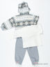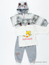 Мягкий трикотажный комплект состоит из толстовки, лонгслива и брюк. Толстовка с глубоким капюшоном, с застежкой на молнию. Длинный рукав и низ изделия присборены на манжеты, два кармана. Лонгслив с округлым вырезом горловины и с длинным рукавом. Брюки с поясом на резинке.