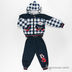 Комплект, состоящий из трех трикотажных предметов: курточка, джемпер, брюки. Толстовка с капюшоном. Центральная застежка на молнию. Длинные рукава с эластичными манжетами. Эластичная манжета по низу изделия. Ткань с рисунком. Лонгслив с круглым вырезом горловины. Длинные рукава. Принт на полочке. Брюки на резинке.