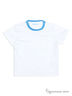 Футболка выполнена из эластичного трикотажа. Застежка на кнопки по линии плеч. Круглая горловина обработана трикотажным кантом контрастного цвета.
