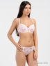 Потрясающий комплект женского белья состоит из бюстгальтера и трусиков стринги. Бюстгальтер с мягкими тканевыми чашечками на косточках. Бюст декорирован кружевной неэластичной вставкой и тонким бантиком с бусинами. Тонкие слабоэластичные регулируемые бретели. Застежка на два крючка на одно из двух положений. Трусы стринги со средней линией талии. Пояс и проймы дополнены резинками. Ластовица дополнена хлопковой подкладкой. Боковины выполнены из тонкого, эластичного кружева.