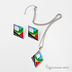 Необычное колье, состоящее из цепочки в виде скрепленных шариков и цветного кулона в форме ромба. Серьги выполнены в стиле кулона.
