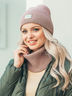 Комплект из шапки и хомута связанные техникой «резинка» с добалением нити люреска. Шапка декорирована нашивкой на подвороте.