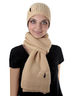 Женский комплект бежевого цвета, состоящий из двух предметов - шапка и шарф. Весь комплект связан крупной вязкой и декорирован вывязанным бантом.