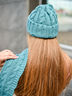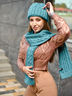 Теплый комплект яркого бирюзового цвета, включает в себя шапку и шарф. Шапка с отворотом, узорная вязка, шарф с таким же узором. Комплект согреет Вас в холодные дни, хорошо дополнит повседневный образ.